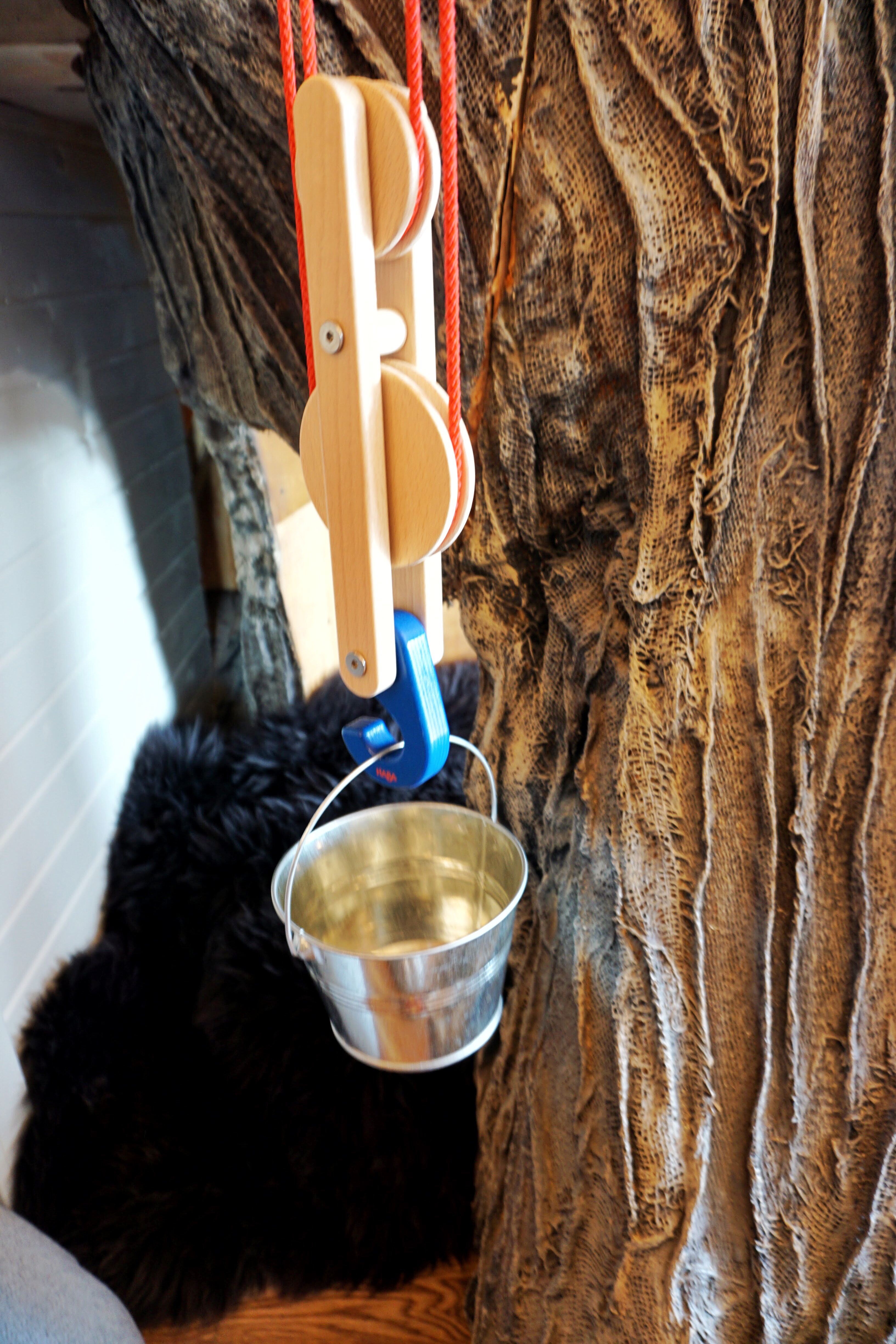 We love our Haba block and tackle too. I like that it’s functional, beautiful and educational. The kids hook on baskets and buckets and haul toys and stuffed animals up and down. We added an eye hook to the second level to hook the end of the rope on. This way even our 2 year old can reach it and pull the bucket up!