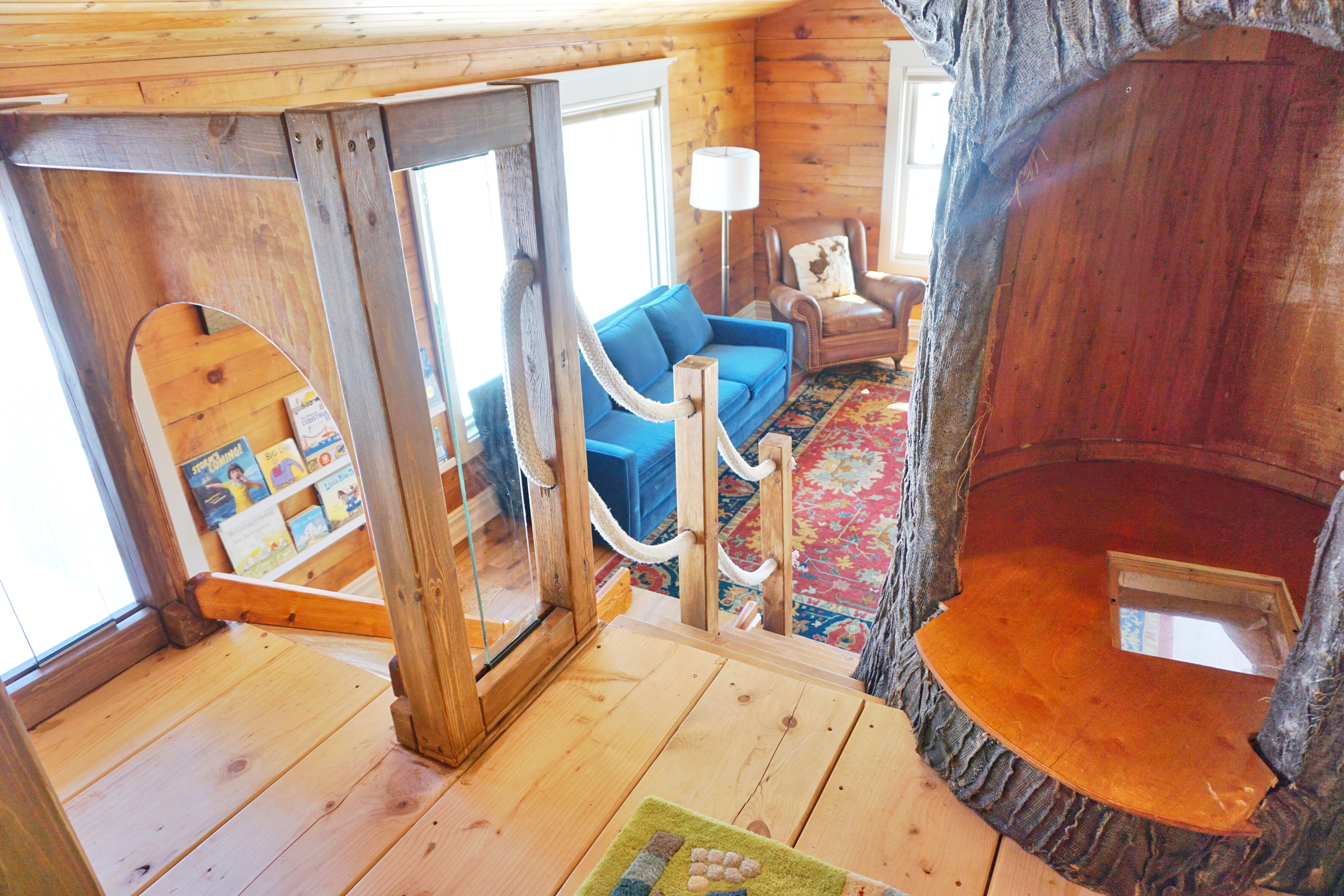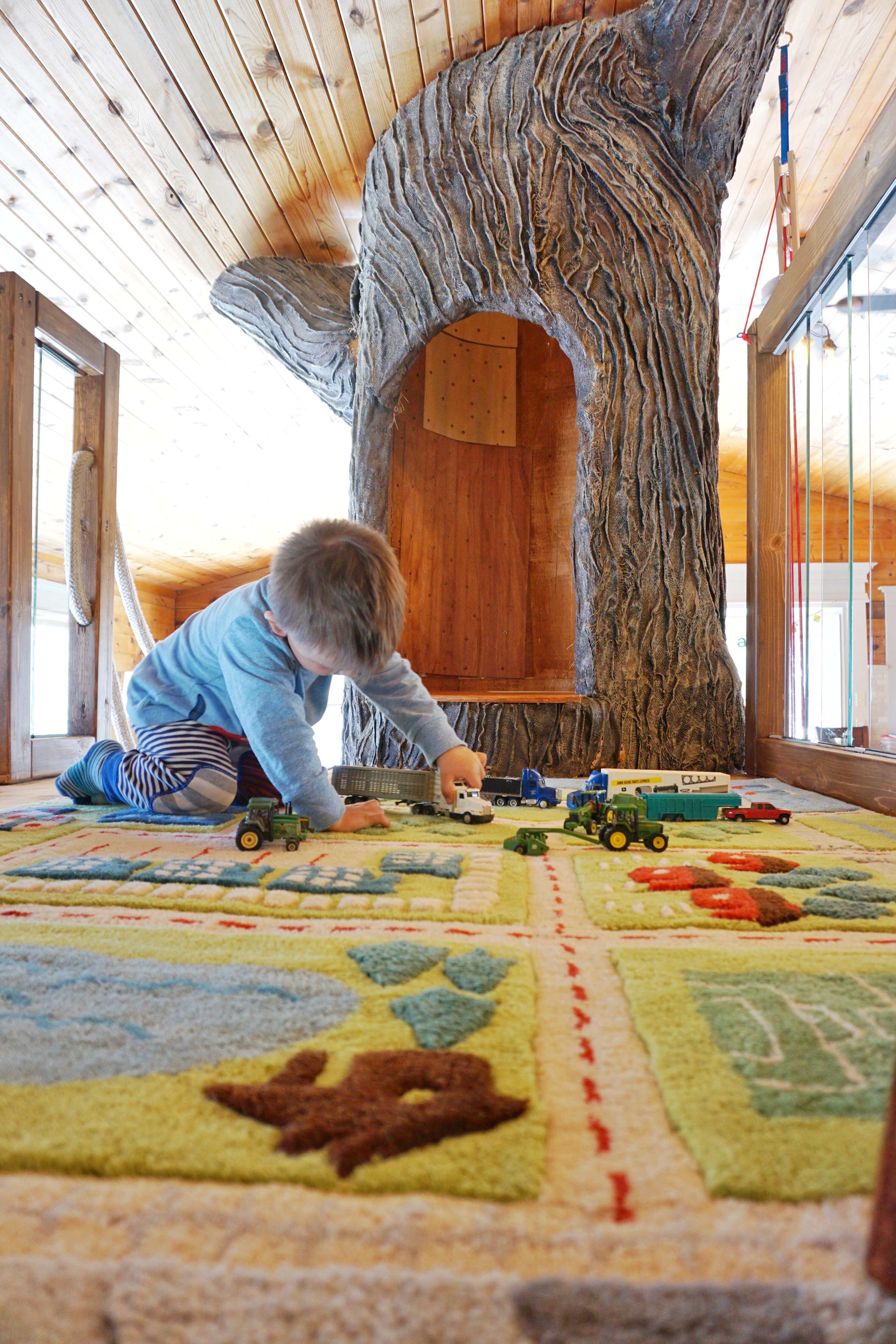 We decided instead of carpeting the second level of the tree house, to choose a 4 X 6 rug. I did a lot of searching for just the right thing. When I saw the, Over the River and Through the Rug, by Land of Nod, I knew I hit the jackpot. Not only is it gorgeous and 100% wool, but it is functional as well. The pile of the rug is so plush, that it makes a cozy spot for reading and lounging. My son loves to drive his cars, trucks and tractors on it and they roll across it smoothly, the weave is just right. But the fun doesn’t stop here!