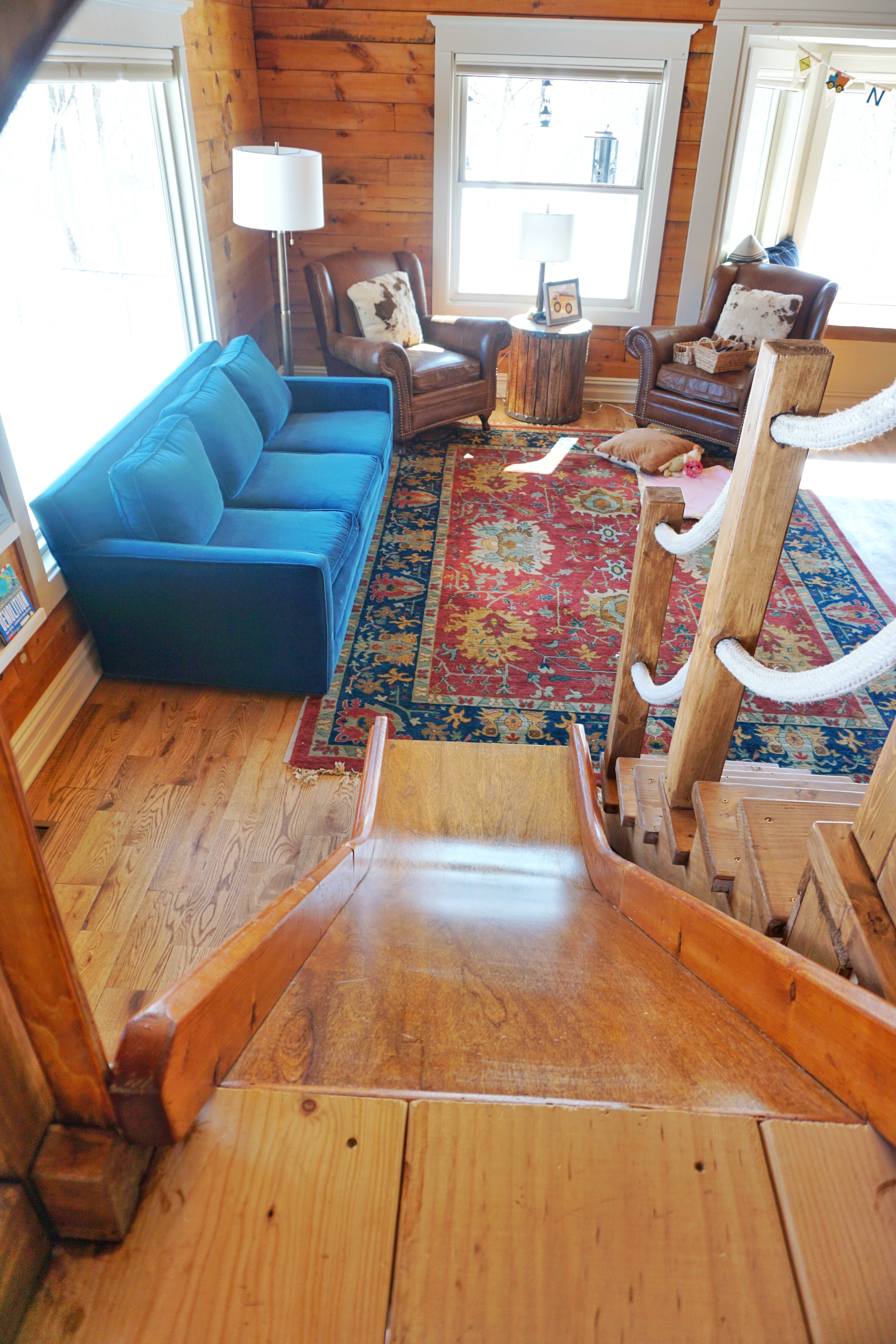 The second level is surrounded by tempered glass (intended for a deck railing) to allow light and sound to travel freely around the room. It’s the perfect amount of autonomy for young children. I can prepare a meal while the kids play and it feels like we are all together, but not tripping over each other.